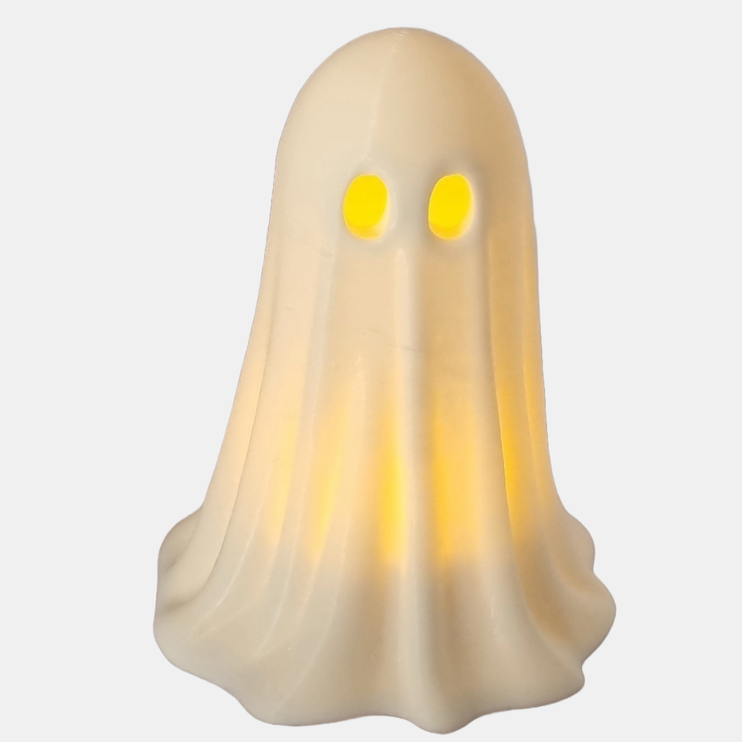 Sæt et elektrisk fyrfadslys under, og se spøgelset lyse op med en (u)hyggelig glød – helt uden røg, varme eller voks i dugen.